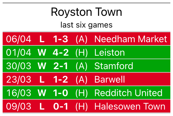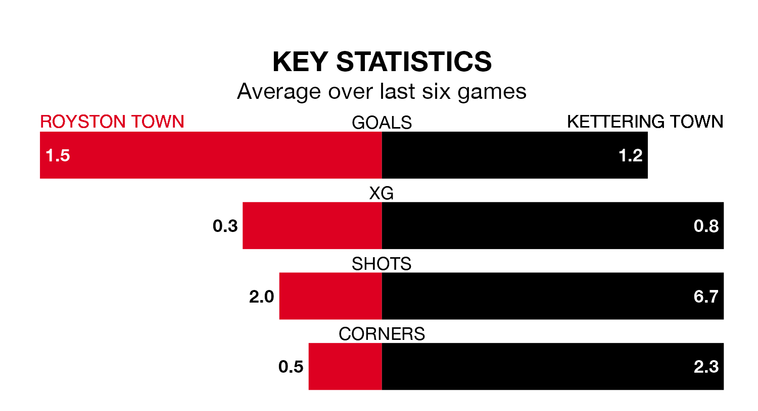 With four wins and a draw over that period, the away side’s form is better – they have taken 13 points from 18, compared to Royston’s nine.