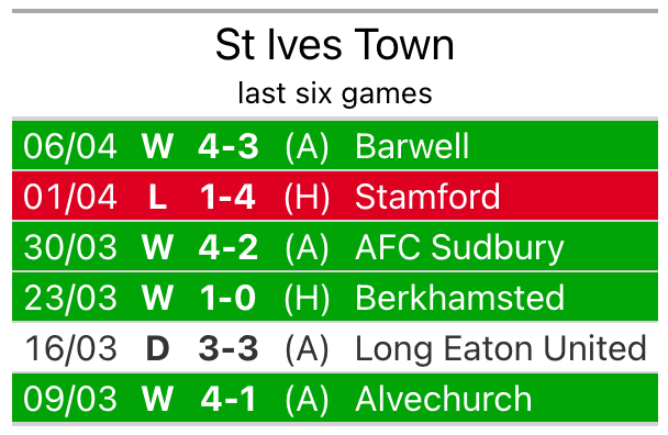 In their last league match, on April 6, St Ives beat Barwell 4-3 away.