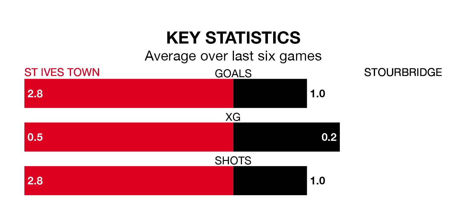 On average, St Ives scored 0.9 goals and Stourbridge 2.2 in those matches.