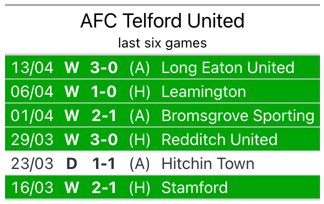 Telford United are in fantastic form in the Southern League Premier Central, with five wins and a draw from their last six games.