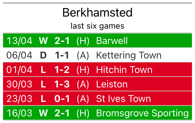 After securing all three points with a 2-1 victory over Barwell on April 13, Berkhamsted sit 21st in the Southern League Premier Central.
