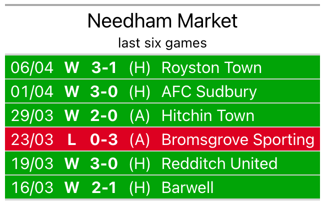Needham Market’s last match was on April 6, a 3-1 win against Royston Town.