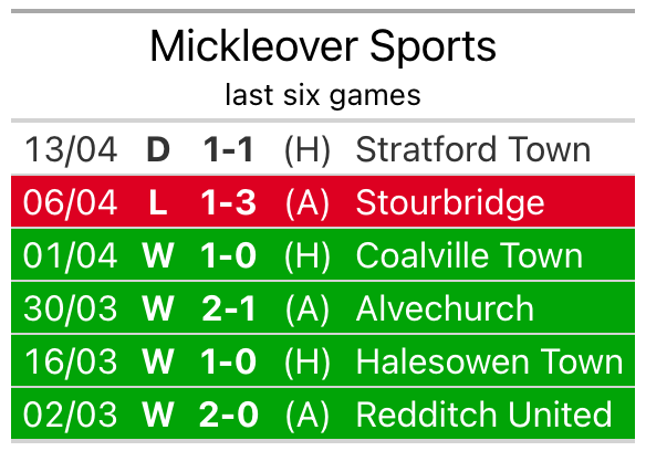 Mickleover Sports drew 1-1 with Stratford Town last time out, on April 13.