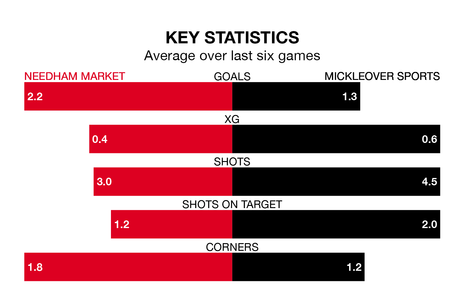 With four wins and a draw over that period, the visitors’ form is slightly worse – they have taken 13 points from 18, compared to Needham Market’s 15.