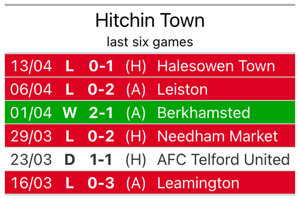 Hitchin lost 1-0 against Halesowen Town last time out, also on April 13.
