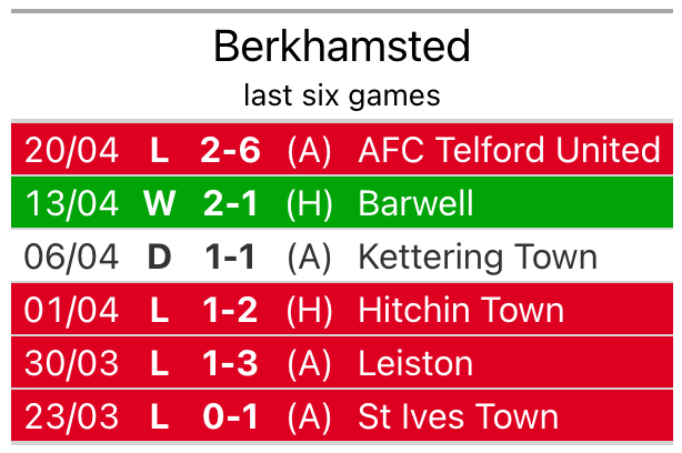 Berkhamsted’s last match was on April 20, a 6-2 loss against AFC Telford United.