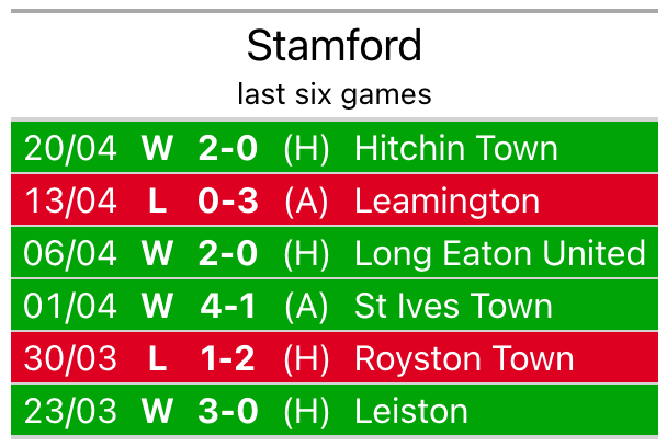 Stamford beat Hitchin Town 2-0 last time out, also on April 20.