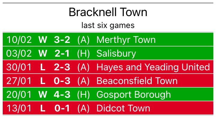 Bracknell’s last match was on February 10, a 3-2 win against Merthyr Town.