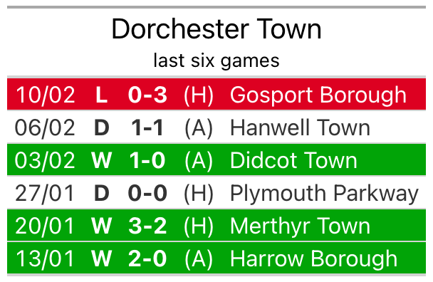 Dorchester lost 3-0 against Gosport Borough last time out, also on February 10.