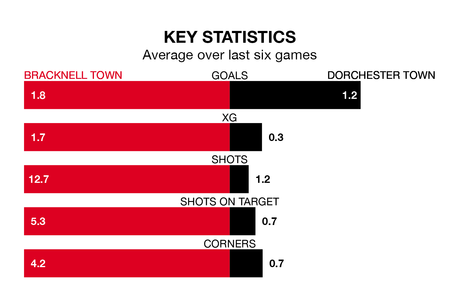 With three wins and two draws over that period, Dorchester Town’s form is slightly better – they have taken 11 points from 18, compared to the home side’s nine.