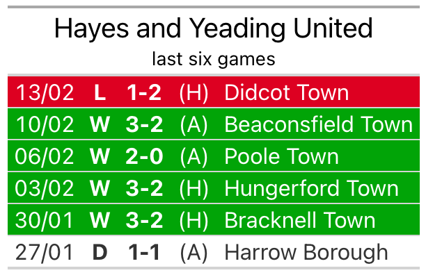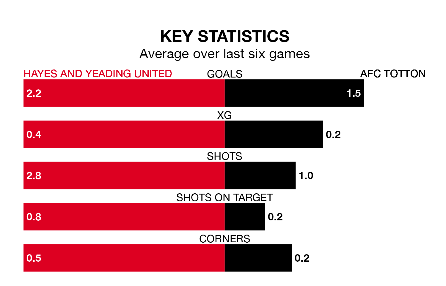 Hayes & Yeading, meanwhile, are below average scorers, with 1.6 goals per game, compared to a league average of 1.7. They have also conceded 1.6 goals per game.