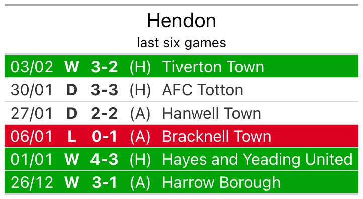 In their last league match, on February 3, Hendon beat Tiverton Town 3-2 at home.