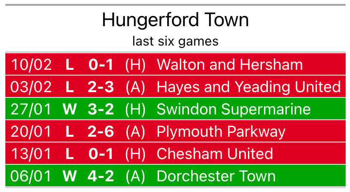 Hungerford lost, 1-0 at home against Walton and Hersham on February 10.