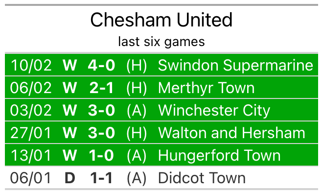 Chesham beat Swindon Supermarine 4-0 last time out, on February 10.