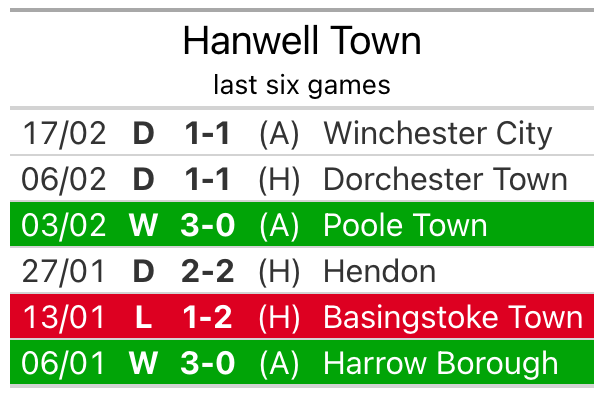 In their last league match, on Saturday, Hanwell drew with Winchester City 1-1 away.