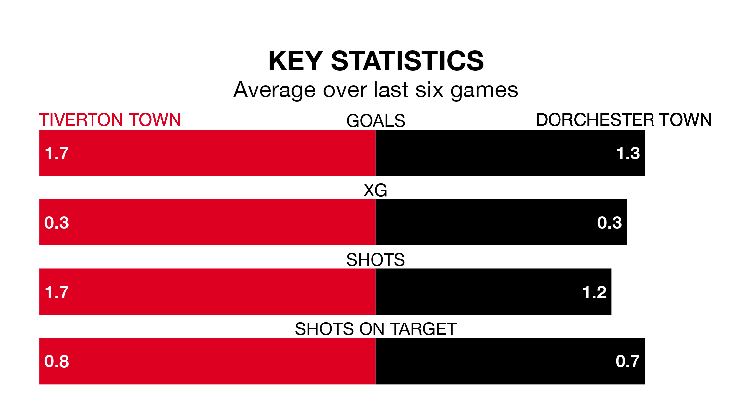 On average, Tiverton scored 1.2 goals and Dorchester 1.8 in those matches.