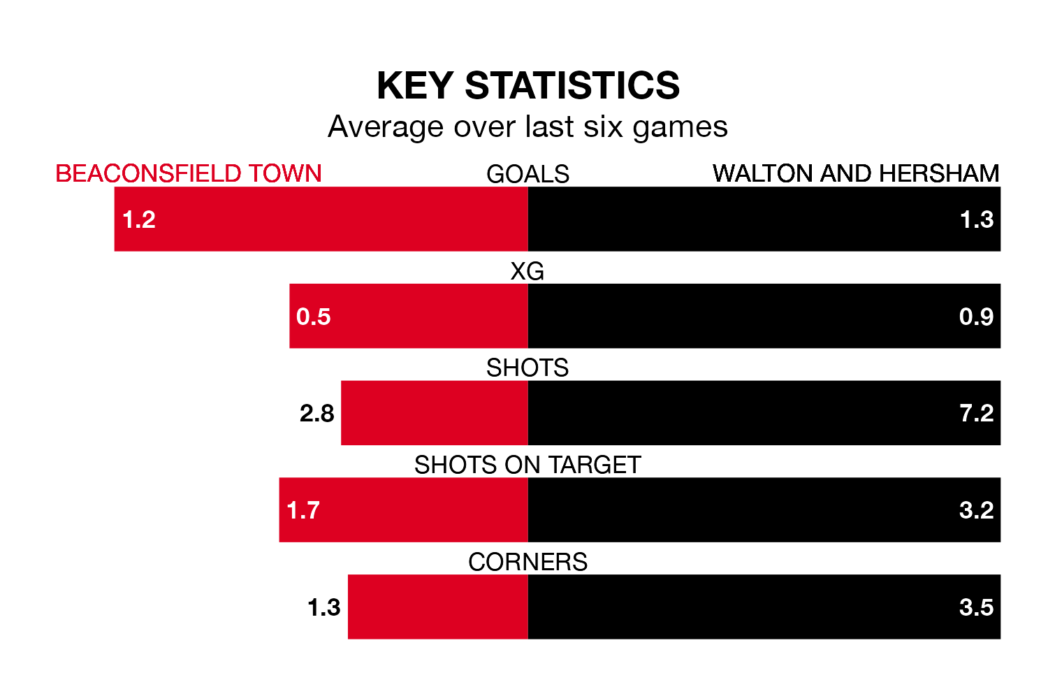 With three wins and a draw over that period, Walton & Hersham’s form is slightly worse – they have taken 10 points from 18, compared to Beaconsfield’s 11.