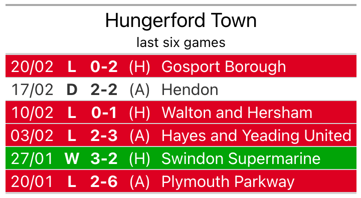 Hungerford’s last match was on Tuesday, a 2-0 loss against Gosport Borough.