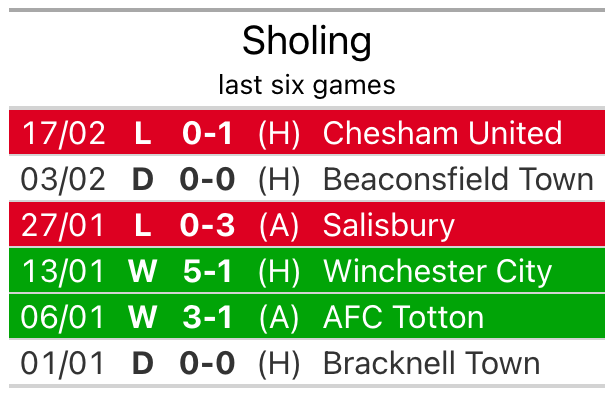 Sholing lost 1-0 against Chesham United last time out, on February 17.
