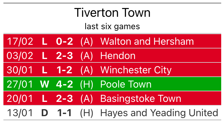 Tiverton’s last match was on February 17, a 2-0 loss against Walton and Hersham.