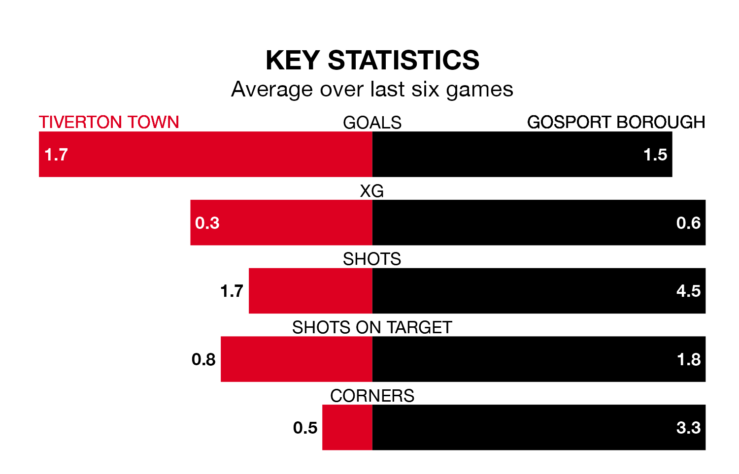 Tiverton, meanwhile, are below average scorers, with 1.6 goals per game, compared to a league average of 1.7. They have conceded 2.0 goals per game.