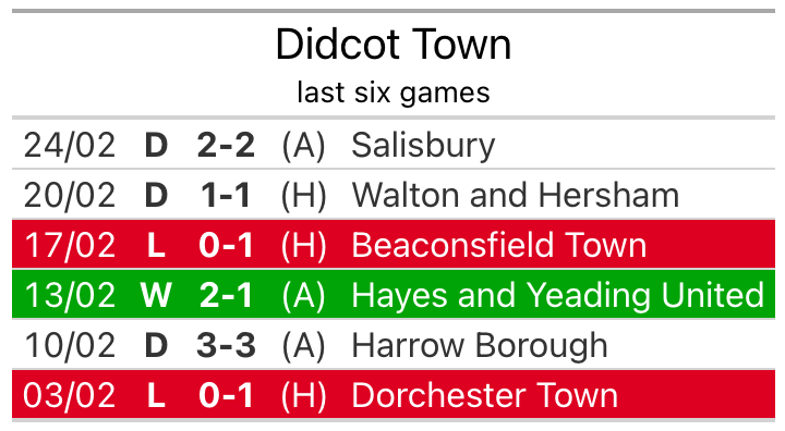 Didcot’s last match was on February 24, a 2-2 draw against Salisbury.