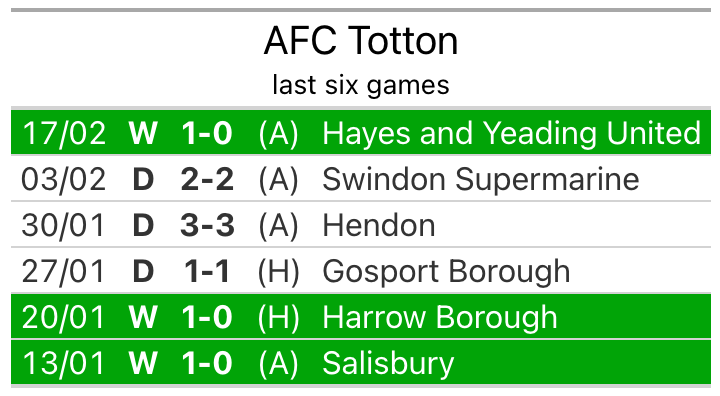 Totton beat Hayes and Yeading United 1-0 last time out, on February 17.