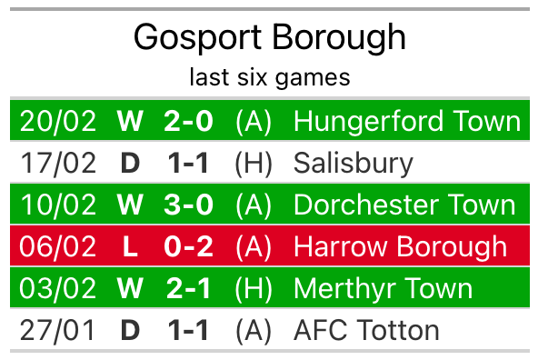 With four wins and a draw over that period, the visitors’ form is slightly better – they have taken 13 points from 18, compared to Gosport’s 11.