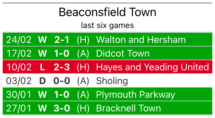 Beaconsfield are 11 places behind Borough in 14th, with 10 wins and eight draws putting them on 38 points.