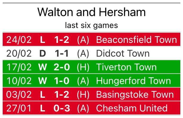 Walton & Hersham are in mixed form in the Southern League Premier South, with two wins and a draw from their last six games.