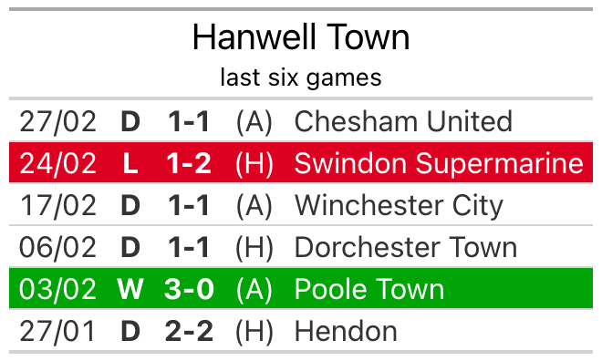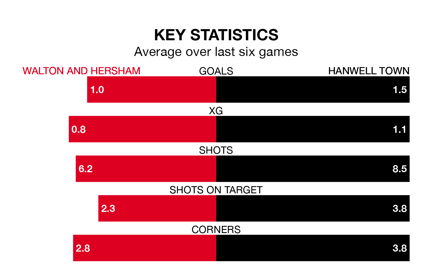 Hanwell, meanwhile, are below average scorers, with 1.6 goals per game, compared to a league average of 1.7. They have conceded 1.8 goals per game.