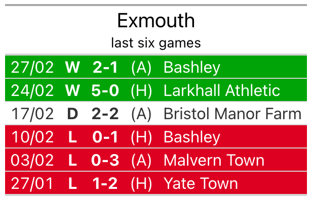 After securing all three points with a 2-1 victory over Bashley on Tuesday, Exmouth sit 19th in the Southern League Division One South.