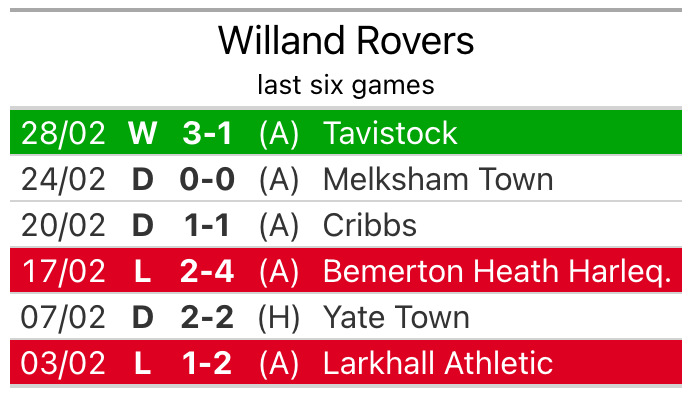 Willand’s last match was on Wednesday, a 3-1 win against Tavistock.