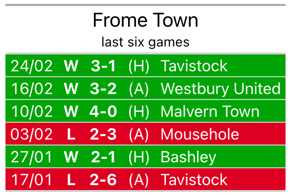 Frome beat Tavistock 3-1 last time out, on February 24.