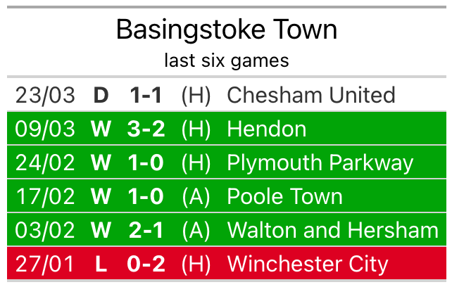 Gosport have picked up 12 points from their last six games, and they face a Basingstoke side who drew their last match, and have collected 13 points from the last possible 18.
