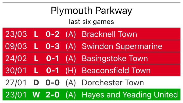 Plymouth Parkway lost 2-0 against Bracknell Town last time out, also on March 23.