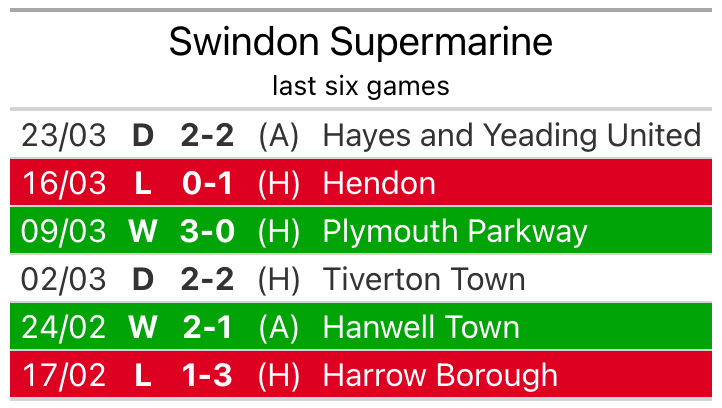 With two wins and three draws over that period, the visitors’ form is slightly better – they have taken nine points from 18, compared to Swindon Supermarine’s eight.