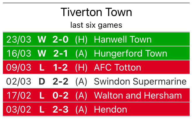 After securing all three points with a 2-0 victory over Hanwell Town on March 23, Tiverton sit 19th in the Southern League Premier South.