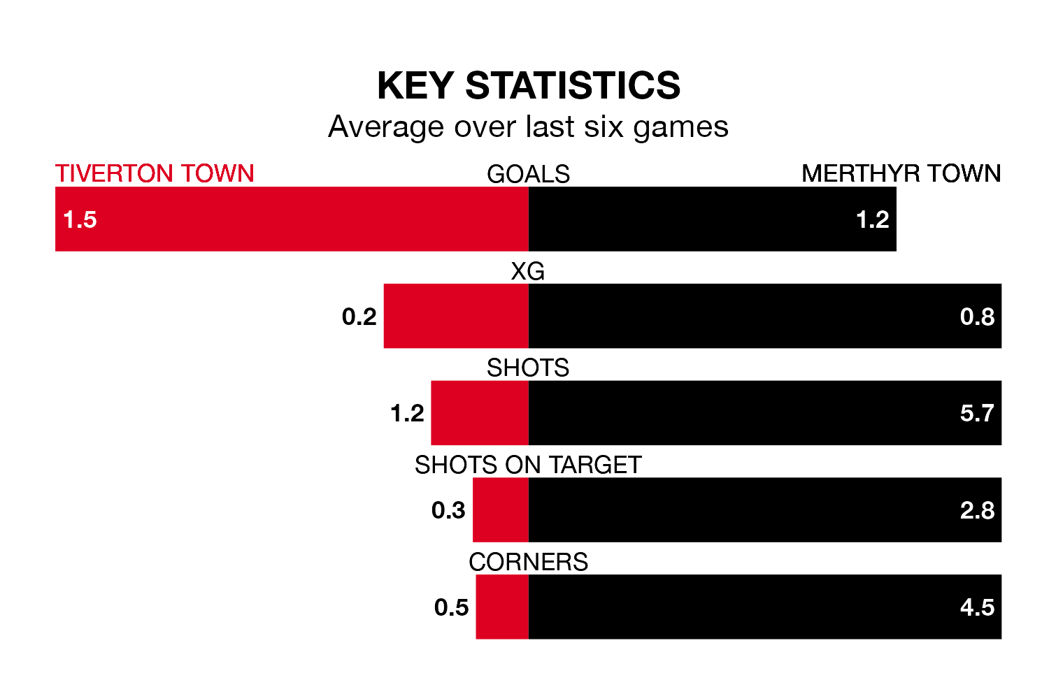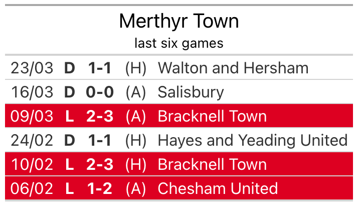 With no wins and three draws over that period, Merthyr Town’s form is worse – they have taken three points from 18, compared to the hosts’ seven.