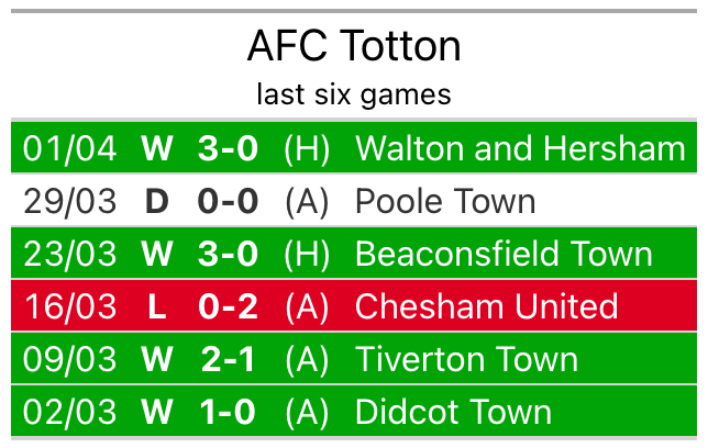 Totton, meanwhile, won their last match, 3-0 against Walton and Hersham.