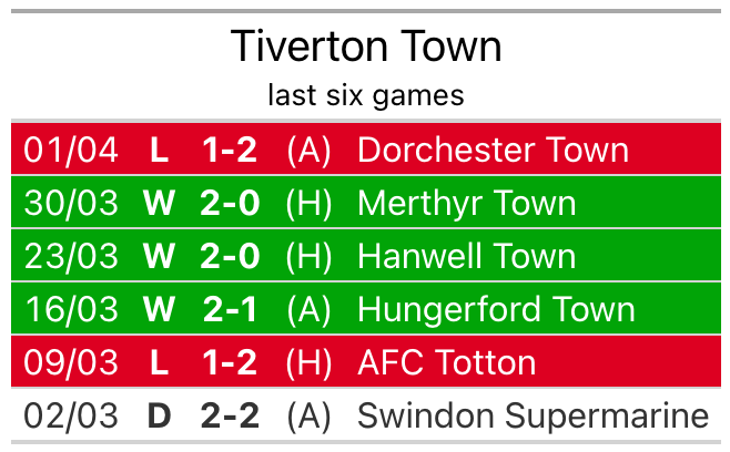 Tiverton are 15 places behind the home team in 19th, with nine wins and 10 draws putting them on 37 points.