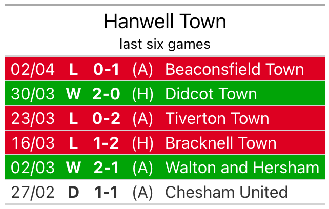 Hanwell, meanwhile, lost their last match, 1-0 against Beaconsfield Town.
