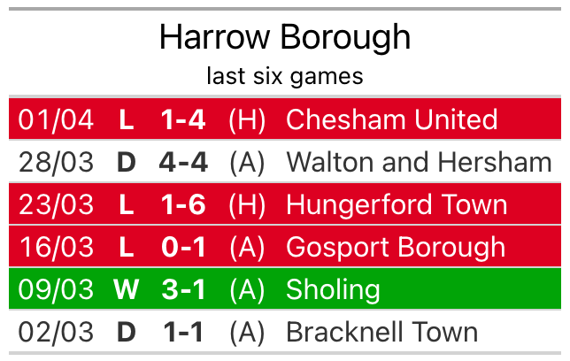 In their last league match, on Monday, Harrow lost to Chesham United 4-1 at home.