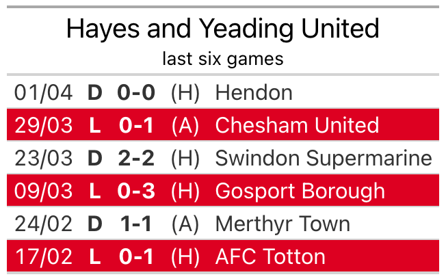Hayes & Yeading are 18th in the table after 36 games, of which they have won nine and drawn 12, earning 39 points.