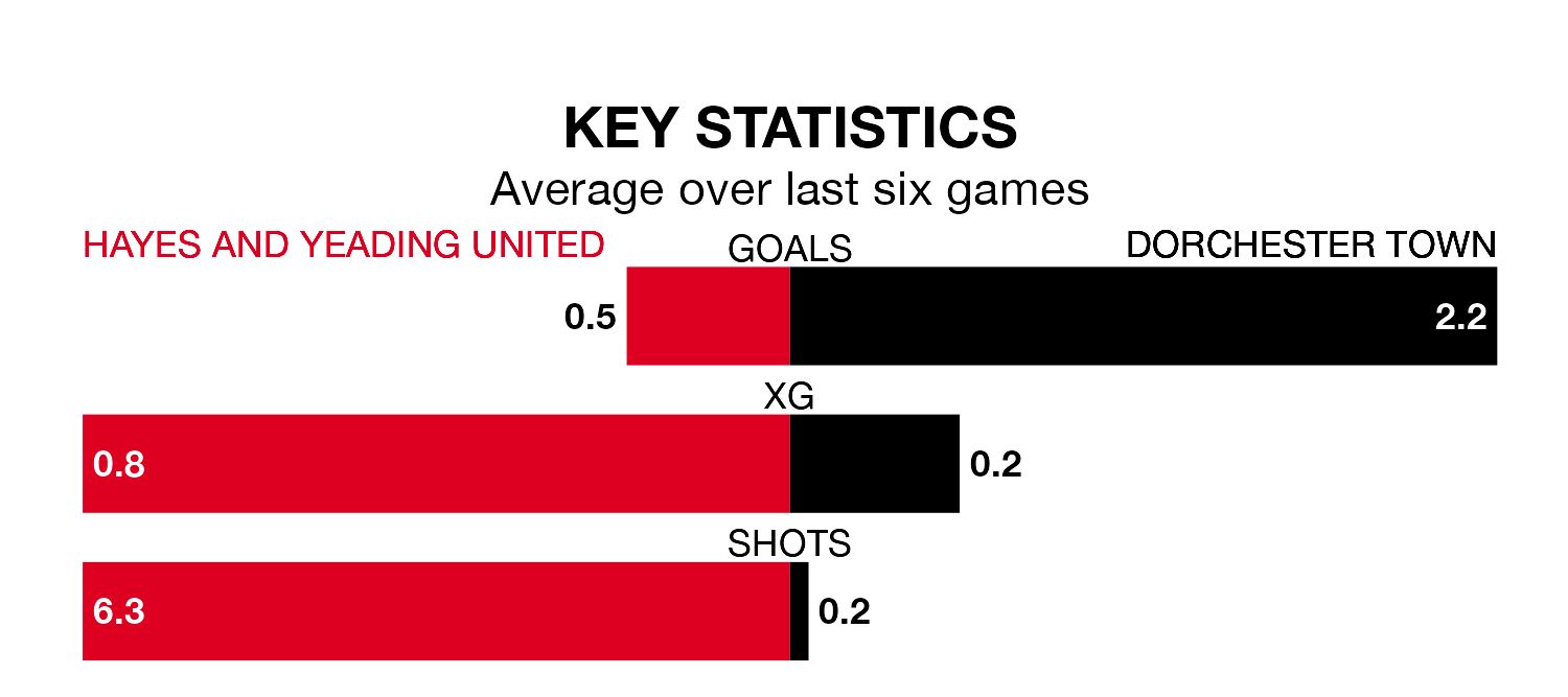 On average, Hayes & Yeading scored 2.0 goals and Dorchester 0.8 in those matches.