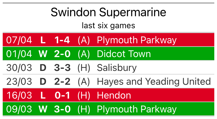 Swindon Supermarine are also average scorers, with 1.7 goals per game. They have conceded 2.3 goals per game.