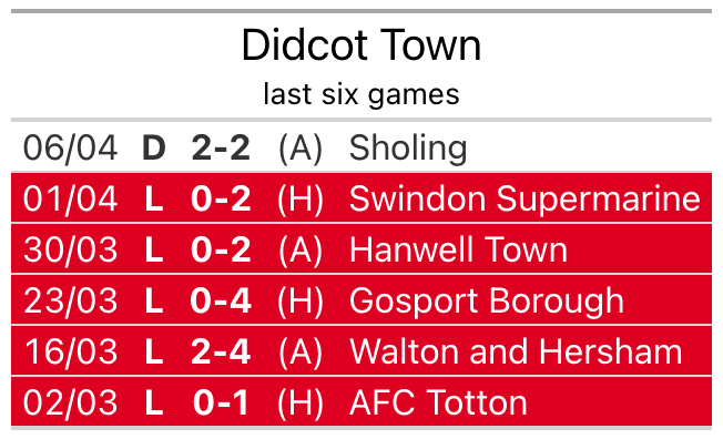 Didcot are in terrible form in the Southern League Premier South, with no wins and a draw from their last six games.