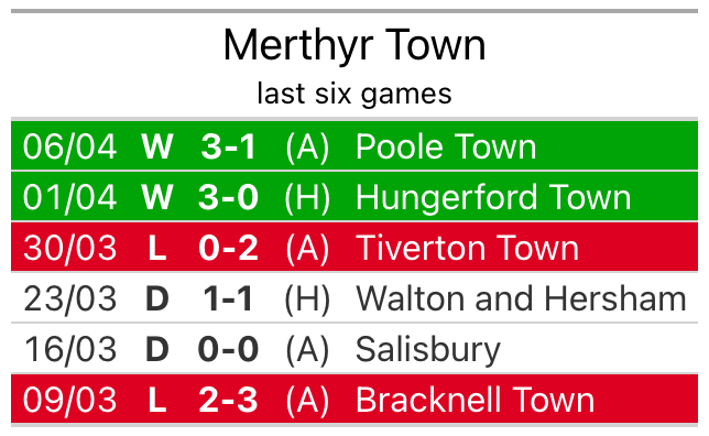 Merthyr are in mixed form in the Southern League Premier South, with two wins and two draws from their last six games.