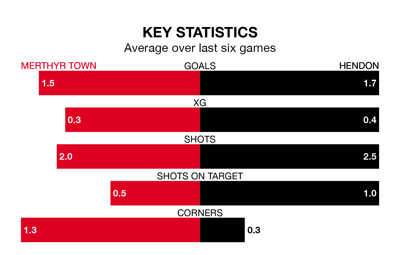 On average, Merthyr scored 0.3 goals and Hendon 2.4 in those matches.