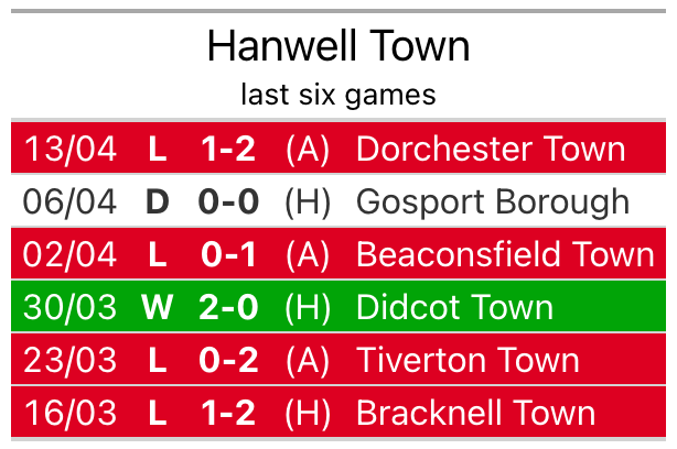 Hanwell’s last match was on April 13, a 2-1 loss against Dorchester Town.